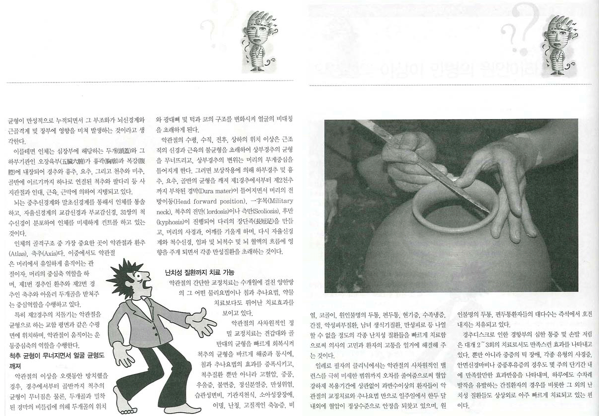 그래서 필자는 질병의 원인이 수없이 많으나, 대부분이 성장하면서 자신도 모르게 잘못된 습관에 의해 발생된 인체골격 및 척추구조의 불균형이 만성적으로 누적되면서 그 부조화가 뇌신경계와 근골격계 및 臟腑에 영향을 미쳐 발생하는 것이라고 생각한다.